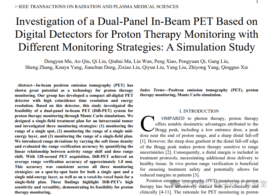 这项结果以"Investigation of a Dual-Panel In-Beam PET Based on Digital Detectors for Proton Therapy Monitoring With Different Monitoring Strategies: A Simulation Study"为题发表在IEEE Transactions on Radiation and Plasma Medical Sciences期刊上。